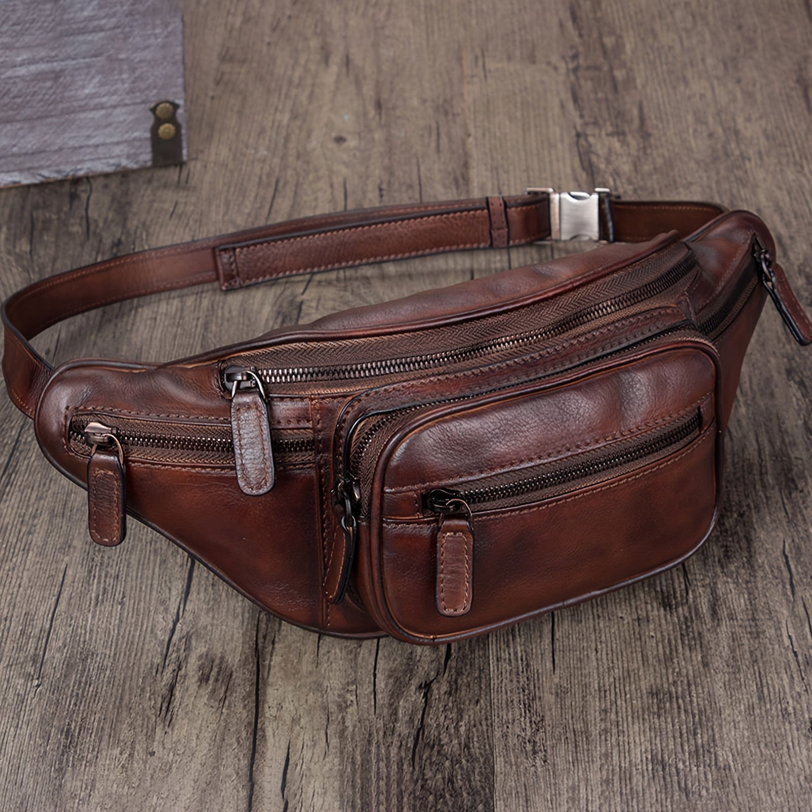 This vintage leather waist bag for men and women features premium full-grain leather with a timeless, rustic finish. It offers compact storage with multiple zippered compartments and an adjustable waist strap for comfortable, hands-free carry. Ideal for stylish, everyday convenience.